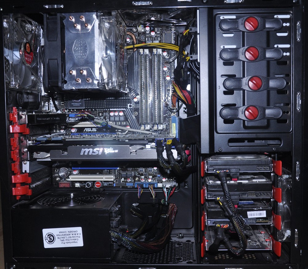 Actualicé la PC, me compré un cooler para el micro, unos coolers thermaltake y coolermaster para el gabinete y lo mas importante una placa de video nueva: MSI N570GTX Twin Frozr III Power Edition/OC, un caño de aquellos! Lo loco es que esta vez me quería pasar a Ati y ya había reservado una MSI R6970 lightning pero la placa era tan grande que no entraba en el gabinete Así que tuve que buscar el equivalente de Nvidia, jaja Nvidia no me deja ir! fotis La fuente está al revés para que quede el cooler para arriba por eso se ve el sticker ese, queda re fulero tendría que pegarle algo ahí.